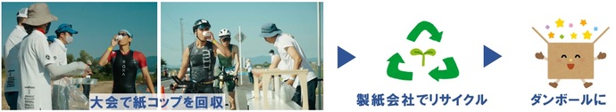 スポーツイベントの実施にあたっては、レース中に選手へ紙コップにより水分提供が行われることから、大量の紙コップが消費されます。しかしながら、これまでは使用済み紙コップは防水加工や汚れなどがあるため、廃棄物(可燃ごみ)とされることが通例です。