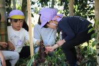 小津こども園の5歳児60人が、地域の蓮生寺に出かけました。グループの友達と一緒に竹林を散策しながら、グループの名前が書かれた名札をタケノコのそばに立てて、「大きく育ったらまた見に来るね」と約束していました。園児たちを見守る蓮生寺の三品さんは、「タケノコも子どもたちも大きく成長してくれたら」と話していました。